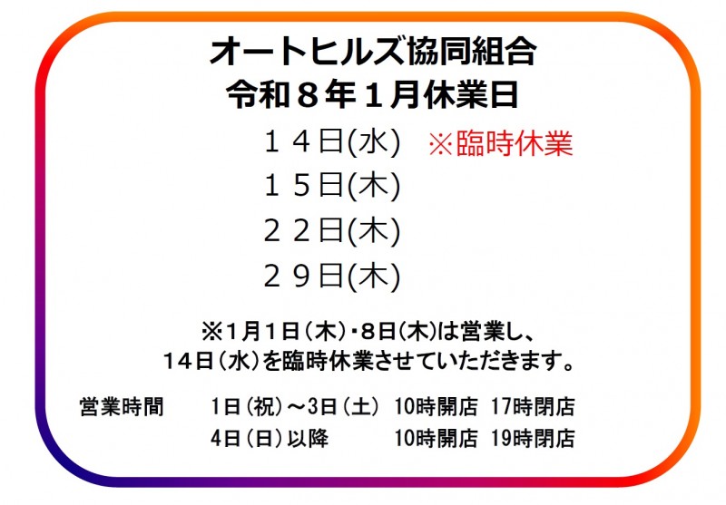 さて、恒例となりましたオートヒルズ新春初売を、元日より開催させていただきます。新しい年明けにふさわしいお車と盛りだくさんの特典で皆様のご来場をお待ちしております。