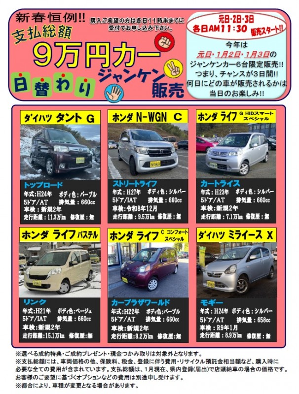 ※新春恒例の「支払総額9万円ジャンケンカー(1月1日~3日限定販売)」は別記事で紹介しておりますので、そちらもぜひご覧ください!!