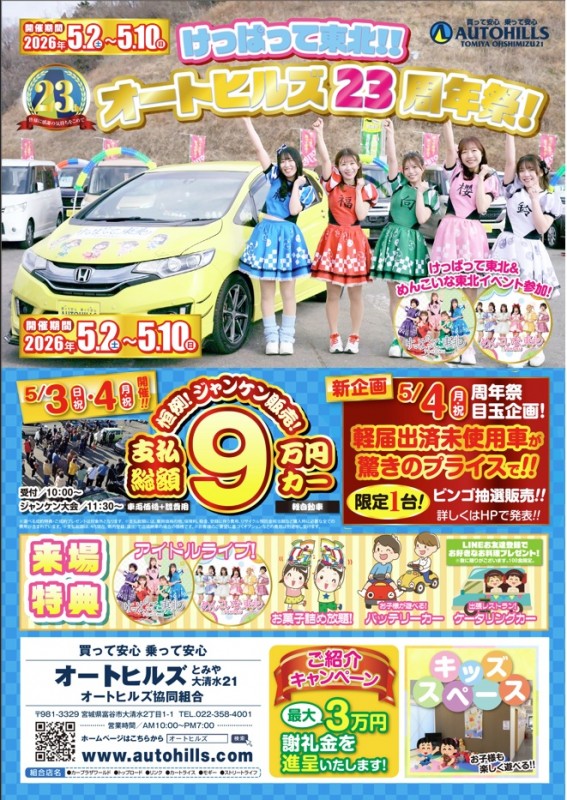 感謝の気持ちをこめて、 「 けっぱって東北!!オートヒルズ23周年祭!」を5月2日(土)より開催いたします。 周年祭ならではの特典とお買い得車を多数取り揃え、 皆様のご来場をお待ち申し上げております。